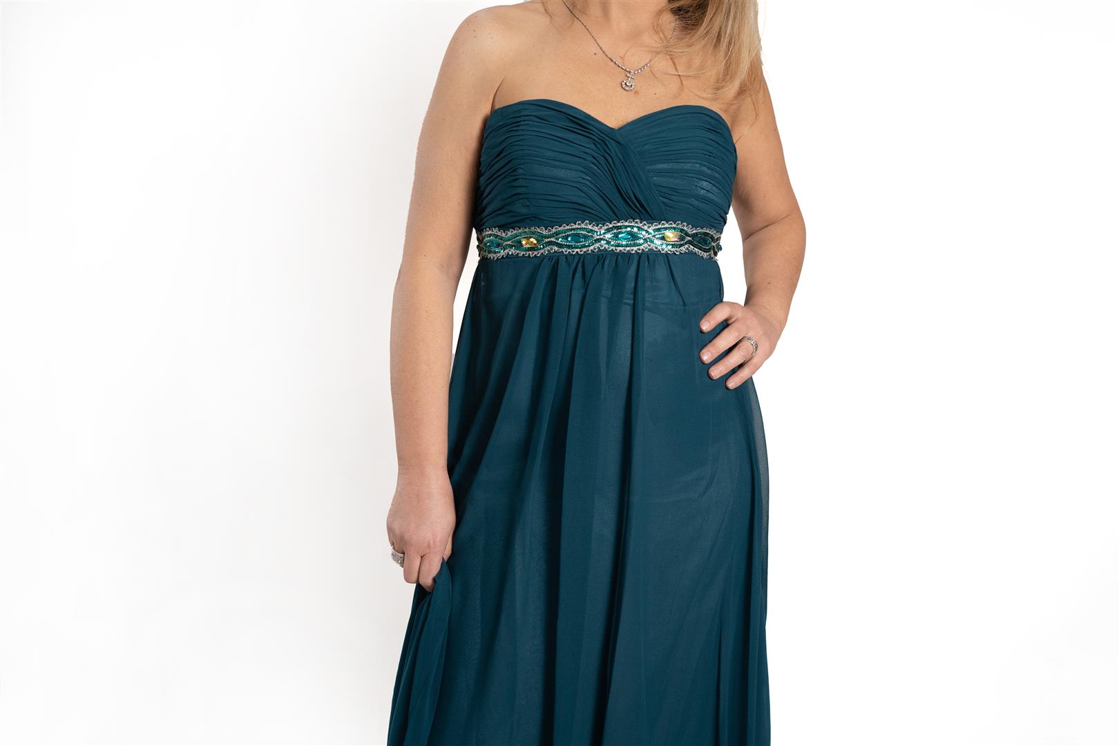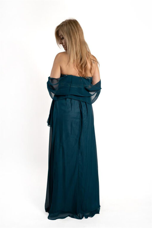 Vestido largo de gasa verde, escote strapless, (con posibilidad de bretel). Detalle de bordado en canutillos y lentejuelas.