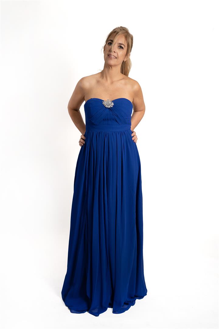 Vestido largo de gasa azul. Varias alternativas de escote, strapless, tiras, semimangas.