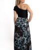 Vestido largo con falda estampada, un solo hombro y con varias alternativas de bretel y lazos bordados.